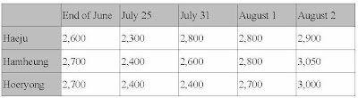 Rice prices, which had gone up all the way to 4,000 won in late May, began to drop in June and stabilized around 2,500~2,700 won in July. As American food were being distributed in July, prices crept down to 2,300~2,400. However, when people realized that external aid was not enough, food prices began to jump again in large increments. For example, in Hoeryong, rice price was 2,400 won on July 31st and went up to 2,700 won on August 1st before going up to 3,000 the following day on August 2nd. In Hamheung City, rice price was 2,600 on July 31st and went up to 2,800 on August 1st and 3,050 on August 2nd.
