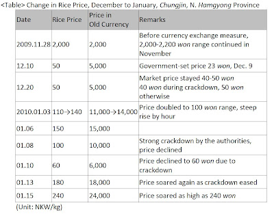 In Chungjin, North Hamgyong Province, the rice price was 2,000 won in November before the currency revaluation measure, and after the measure, the price stayed at 40-50 won throughout December. In 2010, however, the prices are skyrocketing due to the ban on trading, disbandment measure of trading companies and stopped distribution of goods.